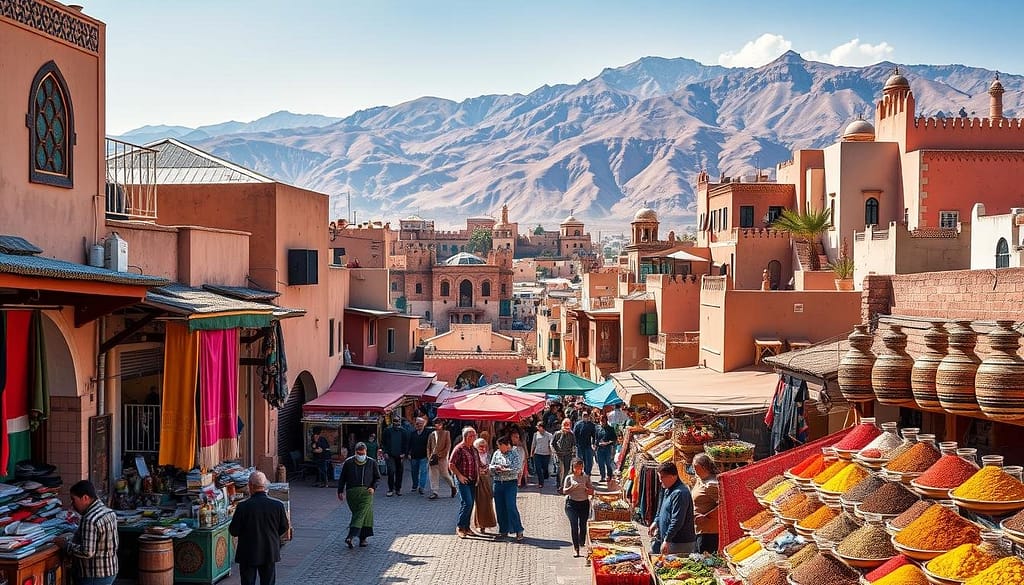 Marrakesh is alive with energy, nestled within ancient medina walls. It’s a mix of old and new, offering everything from lively souks to peaceful gardens and modern art galleries. Every year, about 2 million people come to experience its vibrant atmosphere and famous spots like Jemaa el-Fnaa Square and Jardin Majorelle.