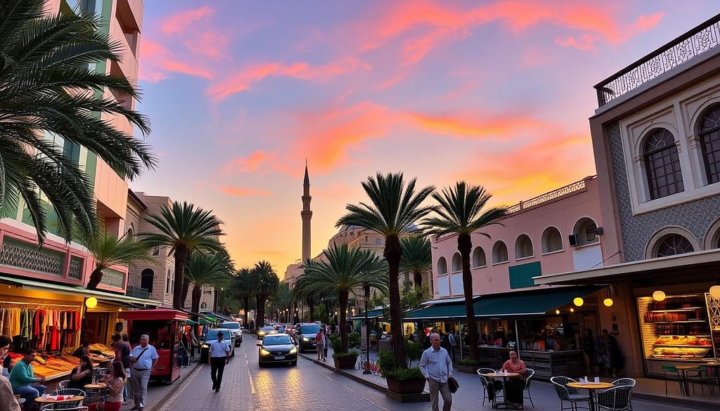 “Vibrant street scene in Casablanca, showcasing the blend of modern architecture and traditional Moroccan design, bustling markets with colorful textiles, palm trees lining the streets, people enjoying local cuisine at outdoor cafes, intricate tilework on buildings, and a stunning view of the Hassan II Mosque in the background during sunset.”