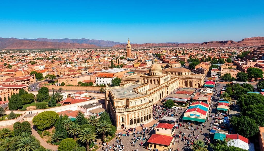 A breathtaking aerial view of Morocco’s majestic royal cities, showcasing the intricate architecture of palaces and mosques, surrounded by vibrant markets and lush gardens, with a backdrop of the Atlas Mountains under a clear blue sky, highlighting the rich colors of traditional Moroccan tiles and the bustling life of the streets.