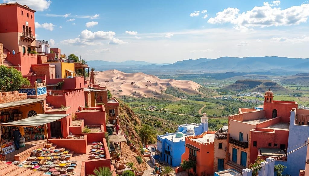 “A vibrant Moroccan landscape in 2025, showcasing a mix of traditional and modern architecture, colorful souks filled with handicrafts, sweeping desert dunes with camels, lush green valleys, and the vibrant blue of Chefchaouen’s streets under a clear sky.”