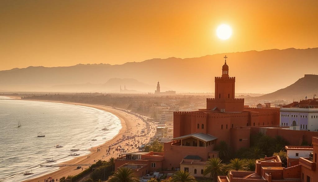 Agadir is a gem on Morocco’s Atlantic coast. It boasts golden sands and a lively vibe. With over 300 sunny days a year and a 10-kilometer-long beach, it’s a top spot for seaside fun.