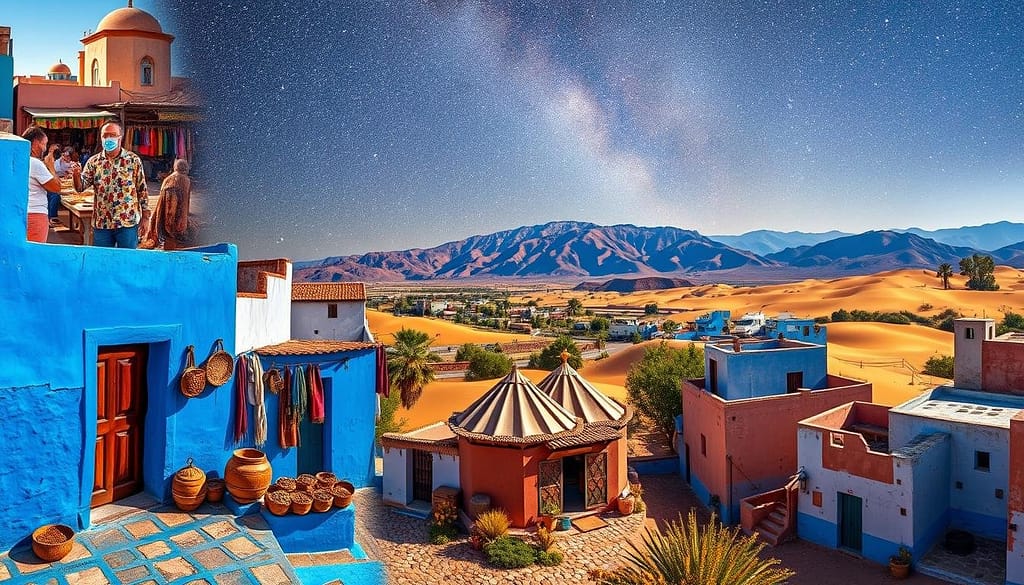 A vibrant Moroccan landscape showcasing diverse elements: the bustling souks of Marrakech with colorful spices, traditional Berber tents in the Sahara Desert under a starlit sky, the stunning blue streets of Chefchaouen, and the majestic Atlas Mountains in the background, all blending seamlessly into a captivating adventure scene.