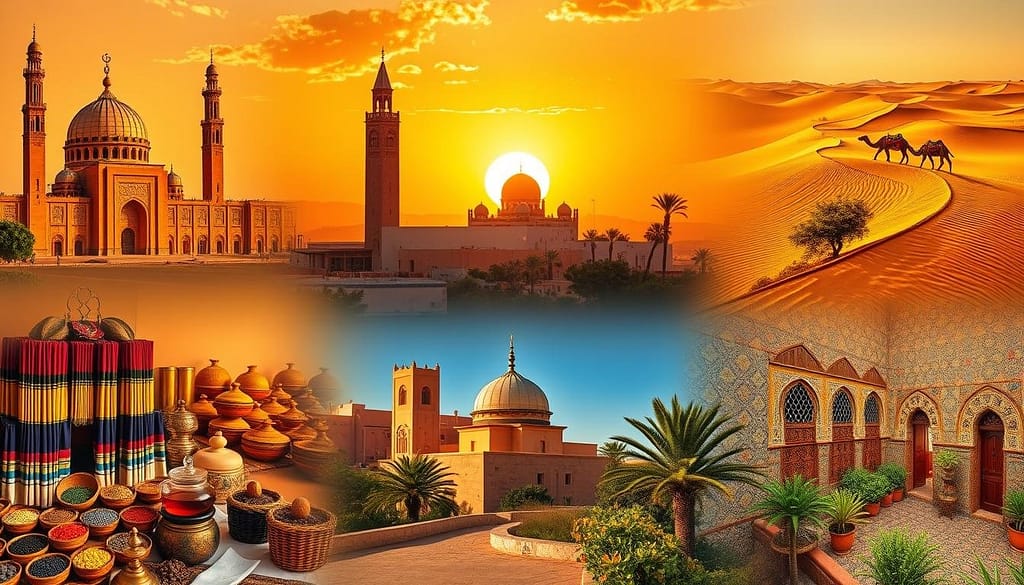 A vibrant collage showcasing the essence of Morocco, featuring iconic landmarks like the Hassan II Mosque, traditional Moroccan markets with colorful spices and textiles, a serene desert landscape with camels at sunset, and intricate mosaic patterns reflecting Moroccan architecture. Include elements like a traditional tea set, a winding alley in a medina, and lush gardens, all bathed in warm golden light to evoke the culture and warmth of Morocco.