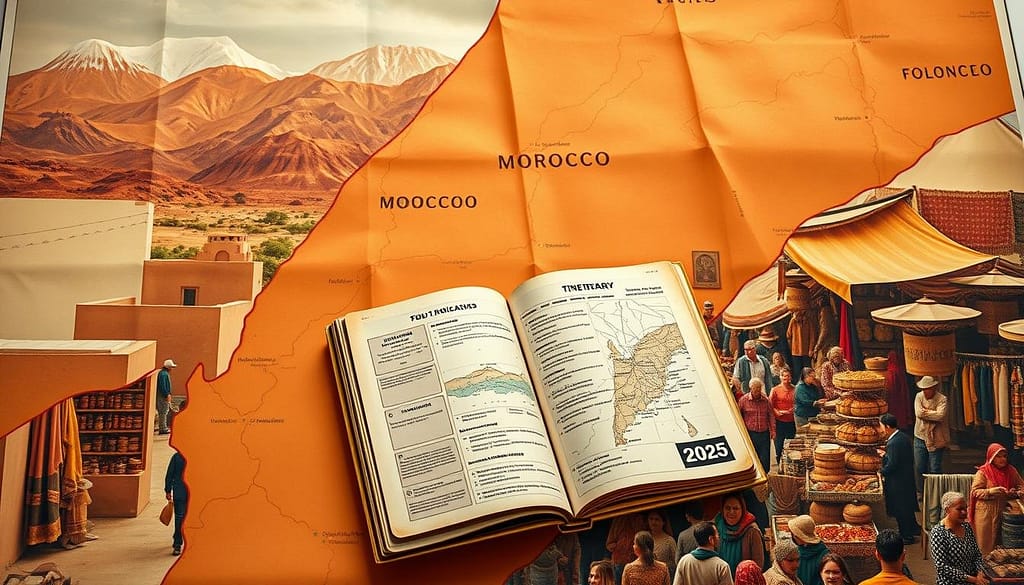 A vibrant map of Morocco unfurls, its contours etched in warm, earthy tones. Idyllic landscapes come into focus – the rugged Atlas Mountains rise in the distance, their snowcapped peaks bathed in golden sunlight. Closer to the foreground, a bustling souk comes alive, its colorful stalls overflowing with intricate textiles, spices, and handcrafted goods. Lively crowds mill about, their laughter and chatter creating a palpable energy. In the center, a weathered travel planner sits, its pages open to reveal a detailed itinerary, marked with historic sites, hidden oases, and aromatic culinary adventures. Soft, diffused lighting imbues the scene with a sense of timeless wonder, inviting the viewer to envision their own Moroccan odyssey unfolding in the year 2025.