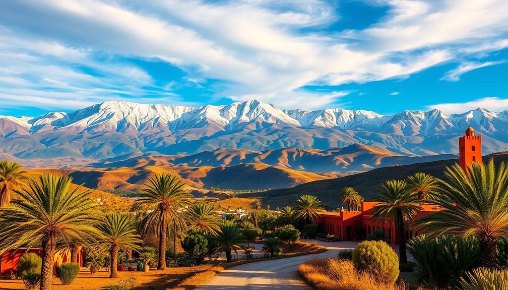 Majestic Atlas Mountains soar into a vibrant azure sky, their snow-capped peaks casting long shadows over rolling hills and verdant valleys below. In the foreground, a winding dirt road leads the viewer through a lush oasis, dotted with towering date palms and the vibrant hues of traditional Moroccan architecture. Warm, golden sunlight bathes the scene, lending an air of timeless elegance and tranquility. The overall impression is one of natural grandeur and the allure of Morocco’s captivating tourism landscape.